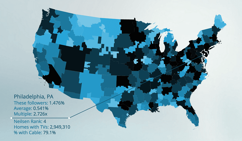 Looking at our DMA maps — one of many insanely cool and informative features available among StatSocial’ s very robust reporting — which shows what portion of a social audience resides in what part of the country, we see that NYC’s prominence is profound.
